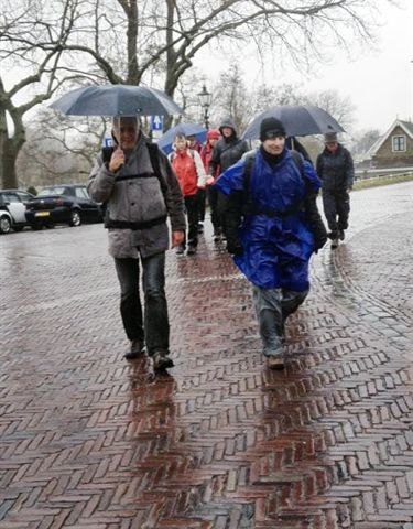 Vandaag lopen we eerst naar Hotel Volendam, voorheen bekend als Motel Katwoude. Bij de verkeerslichten steken we over naar de noodweg die leidt naar de Rietvinkbrug. Maar weinig wandelaars kennen deze weg; door onze medelopers wordt dit dan ook als een aangename verrassing ervaren. Zo vaak loop je hier niet. Na de passage van de brug doen we een bakkie in Monnickendam. “Als je onderweg bent hoef je niet te vasten” aldus Stomp. Dat is duideljik niet tegen dovemansoren gezegd.